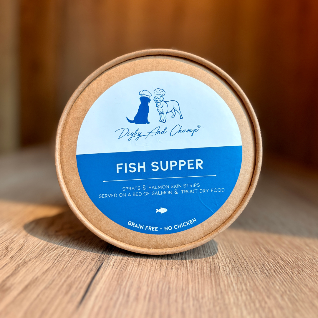 Digby and Champ's Fish Supper, part of our new Dog Supper range. These readymade suppers are handy for over night stays and when you're out and about with your dog but need to feed them. Or, enjoy as an occasional treat dinner!