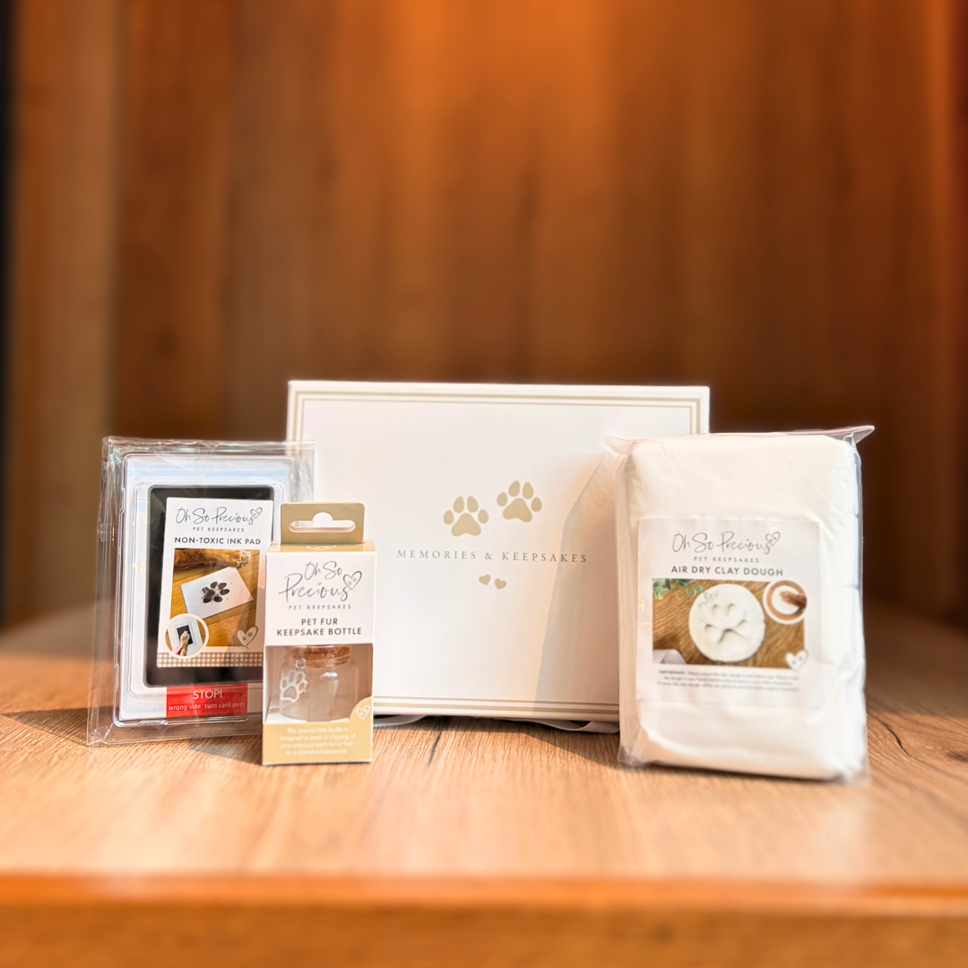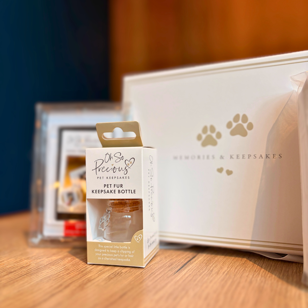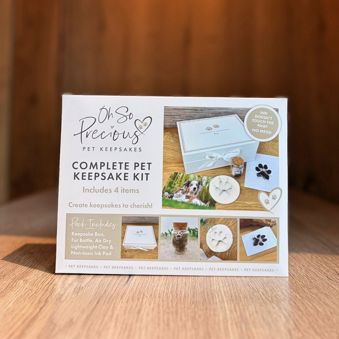 The perfect way to cherish memories of your precious pet, this keepsake box contains a clay impression kit and ink pad for paw prints and a glass keepsake bottle to keep fur/hair clipping safe. The box is perfectly sized to hold all these items as well as cherished collars or leads.