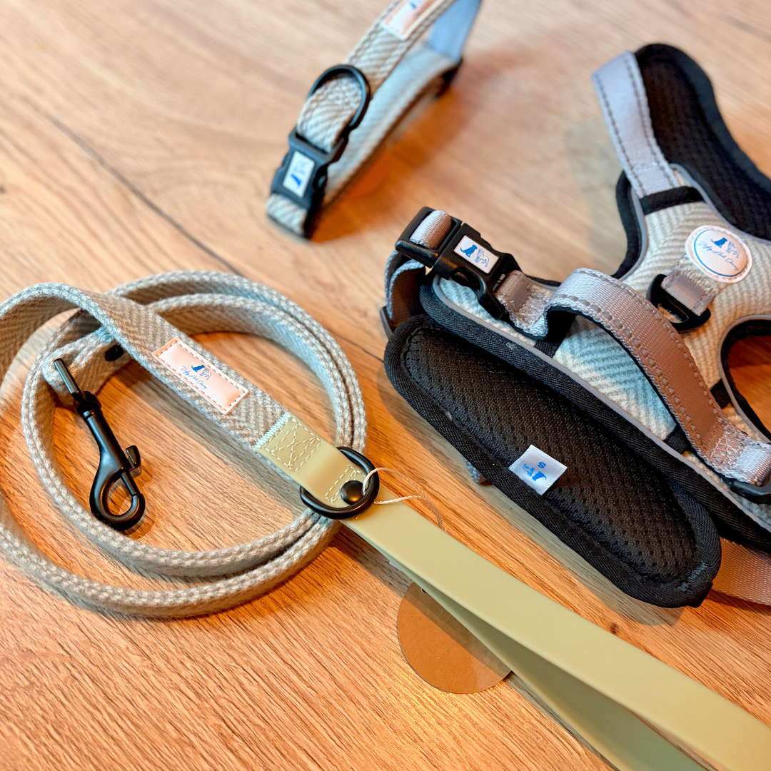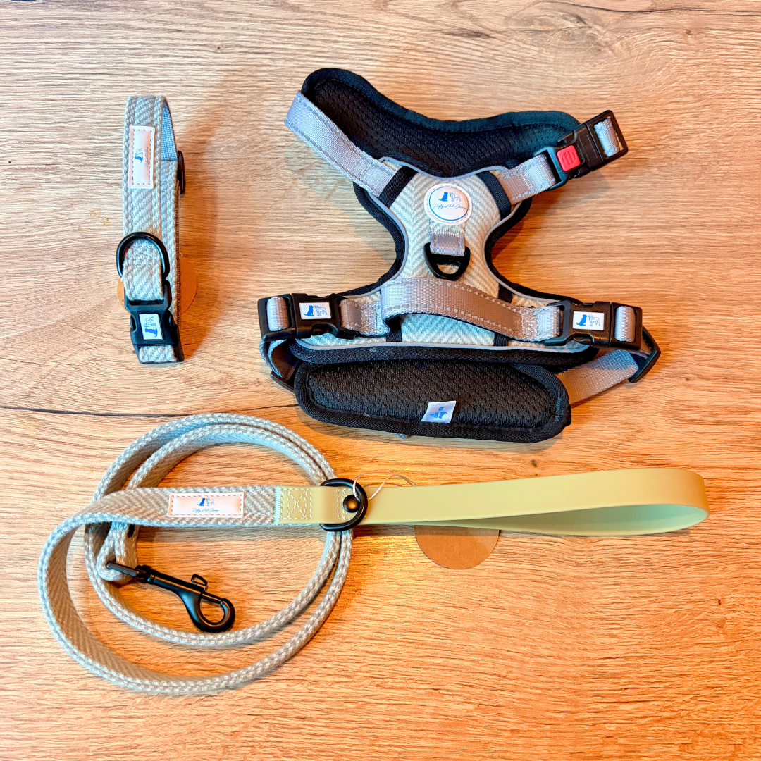 Digby and Champ dog harness sets are designed with practicality and style in mind and perfect for your dogs everyday adventures. The beautiful Sage Green soft, tweed fabric will provide your dog with supreme comfort.